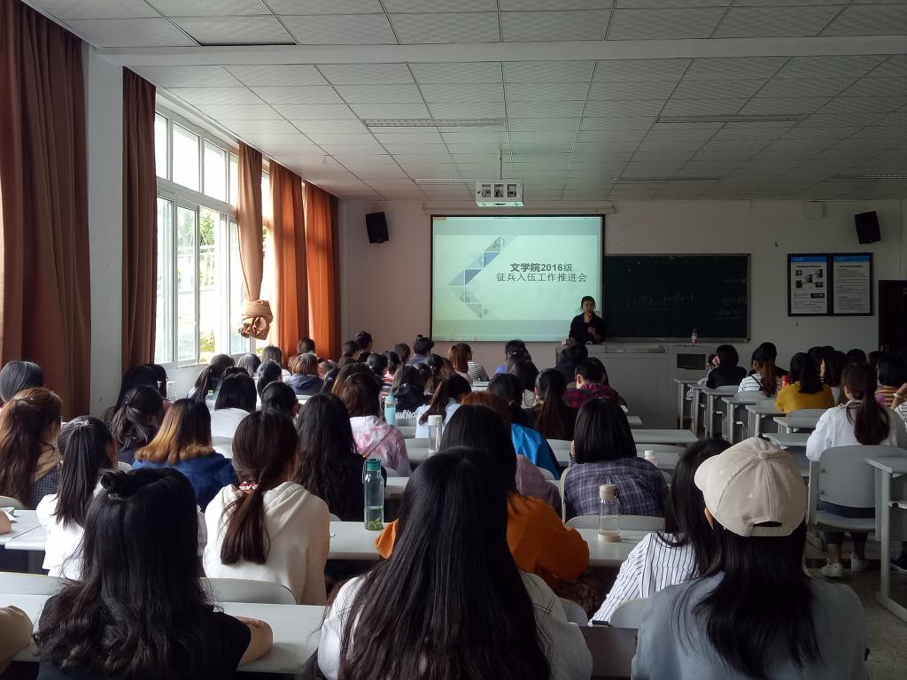 为了加强征兵政策宣传,做好2018年大学生应征入伍工作。5月9日下午14:30,我院于1教219举行“2016级征兵入伍工作推进会”。本次会议由2016级辅导员张悦主讲,我院2016级全体同学参与。