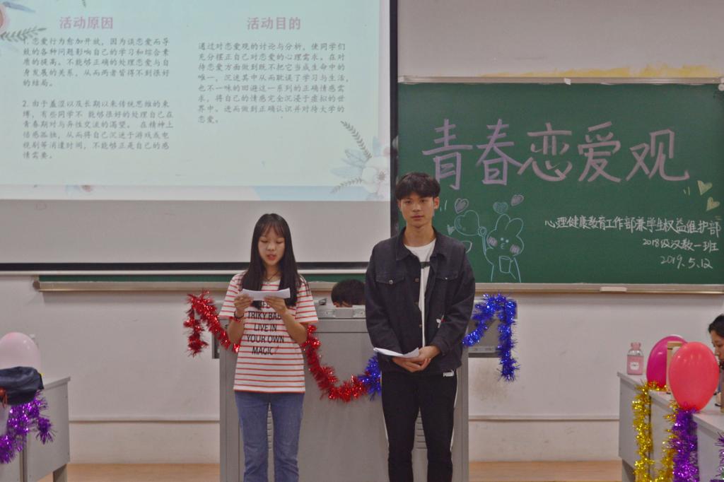 为使我院学生树立正确的人生观和恋爱观,我院心理健康教育工作部兼学生权益维护部于5月12日晚组织2018级各班举办了“青春恋爱观”主题班会。