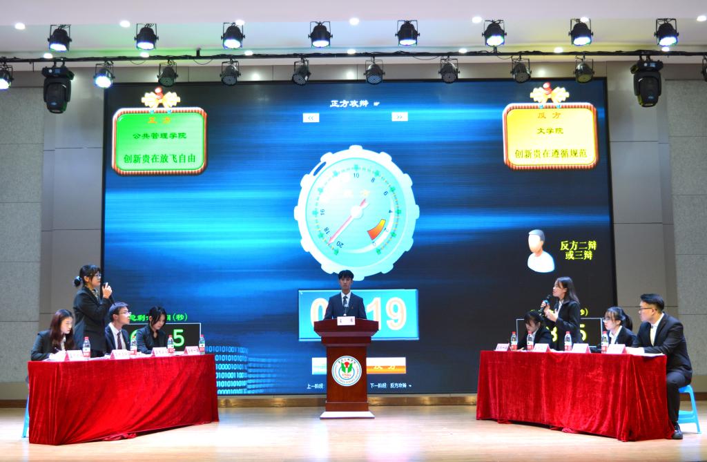 本次比赛双方围绕“创新贵在放飞自由还是遵循规范”进行论述。在开篇立论环节,正方提出了鲜明的观点,解释了创新、放飞、自由的内涵以及自由对创新带来的作用等。反方则运用正反例子,阐述了遵循规范对创新有着基础、修正作用,并且在创新的不同阶段中的具有指导意义。接着,双方辩手交替发言,多方提问,撕细抓漏,答中有问,层层深入,反方辩手运用扎实的文化基础、清晰的逻辑和犀利的言辞使他们的论点逐渐站稳脚跟。随后,双方四辩重申己方观点并以简洁深刻的语言总结陈词。经过激烈的辩论后,评委从辩论内容的角度和深度对双方辩手进行了点评。