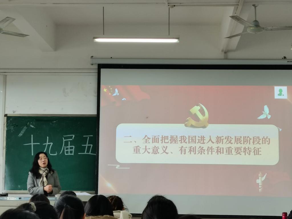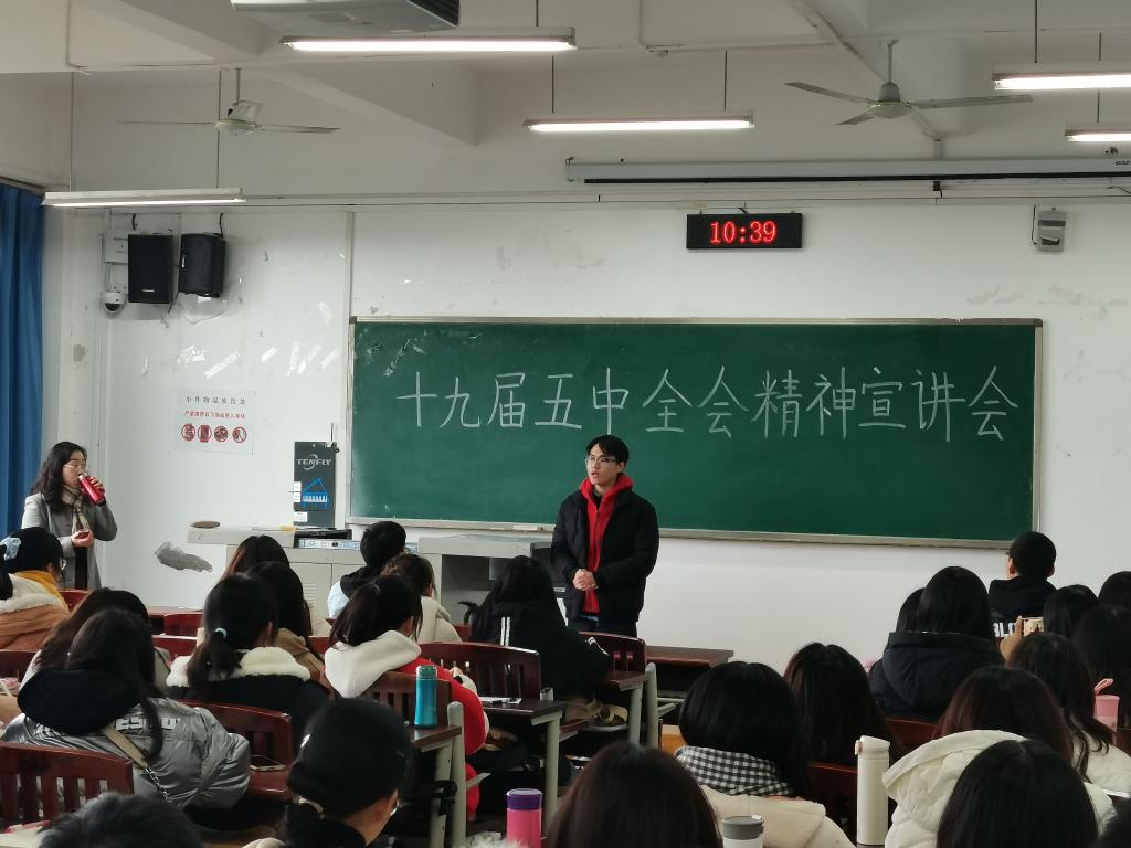 为深入贯彻落实党的十九届五中全会精神,12月3日上午,我院在明辨楼1栋403室举行了十九届五中全会宣讲活动,2020级汉语言文学(师范)1班和2班全体同学参与会议。宣讲会由必赢线路检测党总支书记唐晓萍主讲,2020级汉语言文学(师范)1班班长陈庭立主持。