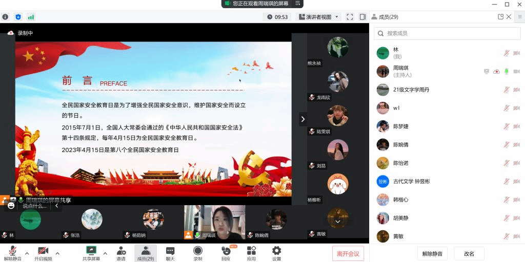 本次活动,团支部围绕“何为国家安全”“当前国际国内形势”“危害国家安全的行为及相关罪名”“如何维护国家安全”“谁来保卫国家安全”等内容,结合校园安全、人身安全等规章制度进行拓展延伸。介绍“全民国家安全教育日”和讲解违反国家安全法律的案例后,同学们意识到,国家安全教育是每个公民的“必修课”,是保障国家政治、经济、文化稳定发展不容忽视、不可或缺的重要基础和条件,国家安全就在身边,每个人都是国家安全的一道防线。