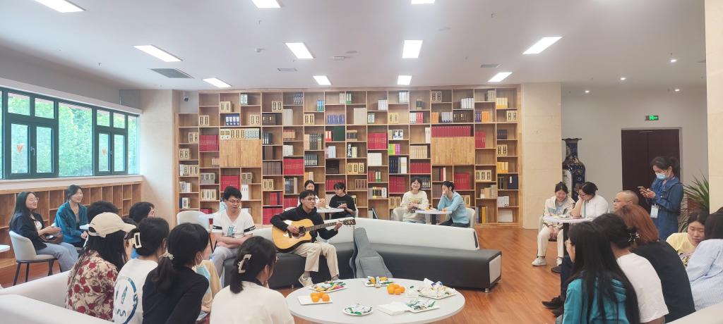 在袁威同学吉他弹唱的带领下,全班同学与图书馆老师合唱《稻香》,合唱结束后在图书馆合影留念,为此次座谈会画上圆满的句号。