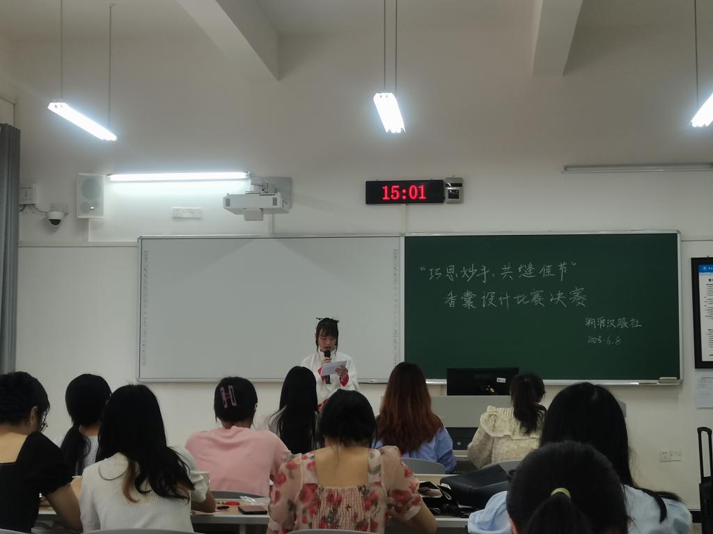 学生团体联合会主席张鑫作总结发言,她指出每个作品的闪光点和不足之处,并提到本次香囊设计制作比赛不仅为巧思妙手的同学们提供了展示平台,还充分发挥了手工创造价值,更彰显了我院学子传承优秀传统文化的可贵精神。