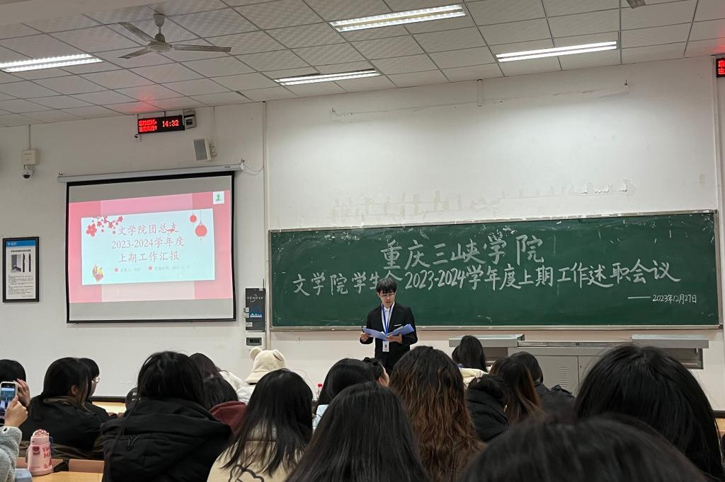 为对本学期的工作做出及时反馈和有效考核,加强各部门、协会思想建设,我院于12月27日下午在明辨楼2栋103室成功举办团学联2023—2024学年秋期工作述职会议。学工办主任兼团总支书记张悦、第十届主席团成员刘东、任荟杉、涂小玲、方桐参会。