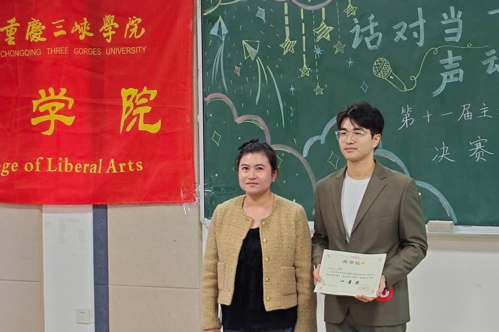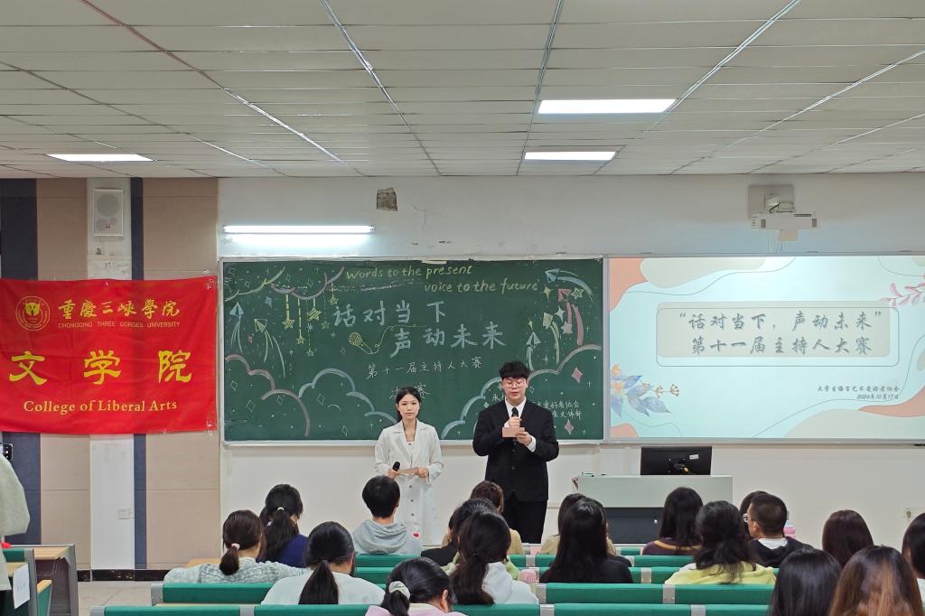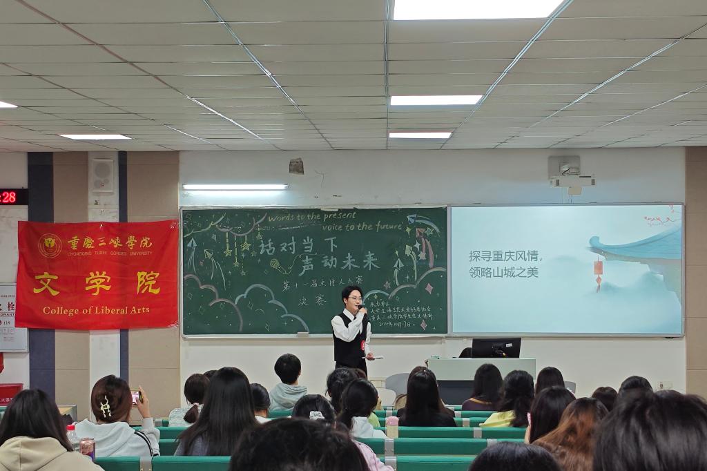 话语,是时代的回响;声音,是未来的先声。10月17日下午,由大学生语言艺术爱好者协会主办的第十一届主持人大赛决赛于博学楼1栋401室举行。学工办主任兼团总支书记张悦、2021级辅导员张扬、第十届团总支副书记刘东、第十届学生团体联合会主席任荟衫、第十届主席团成员涂小玲、方桐担任评委。