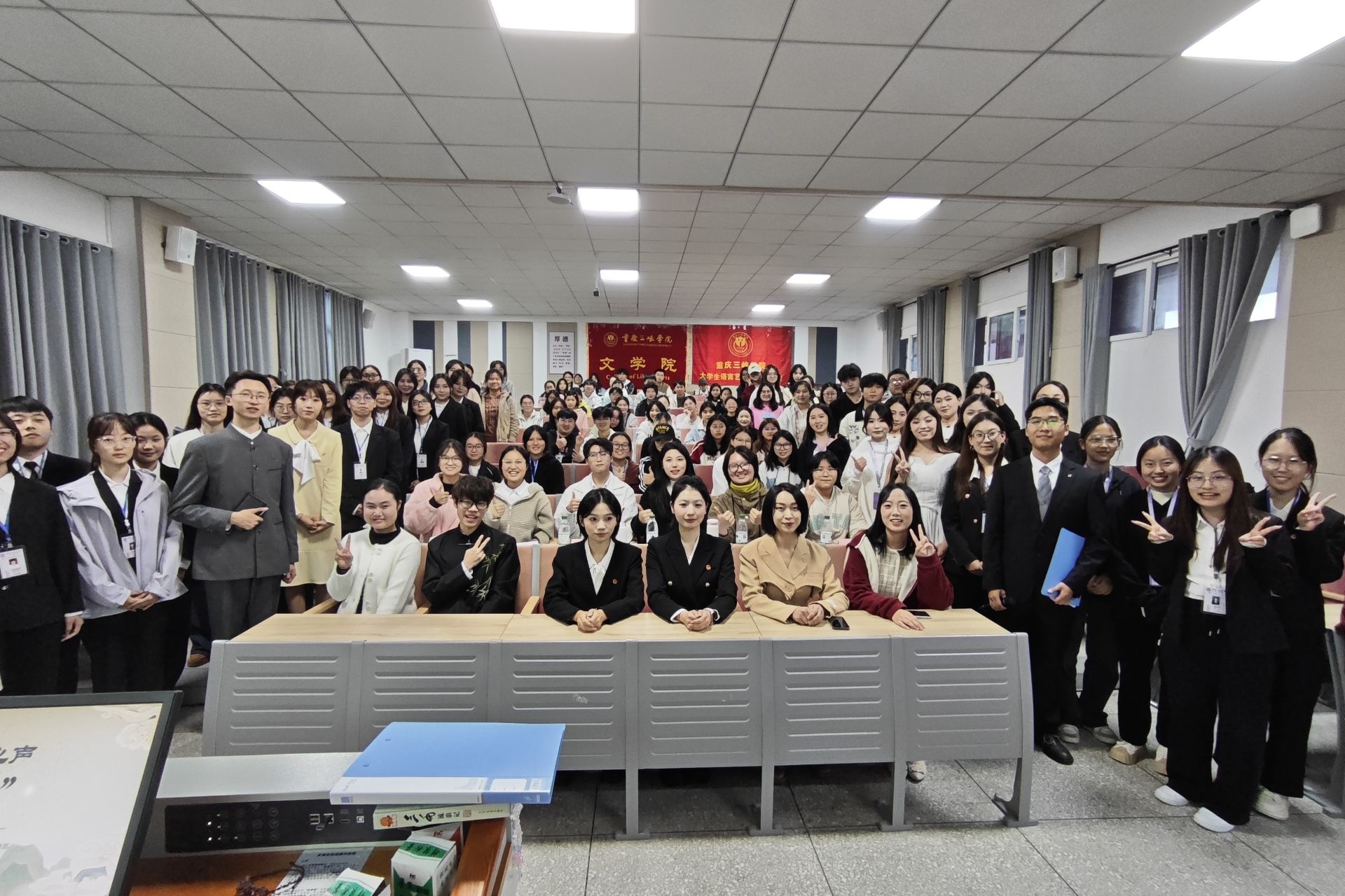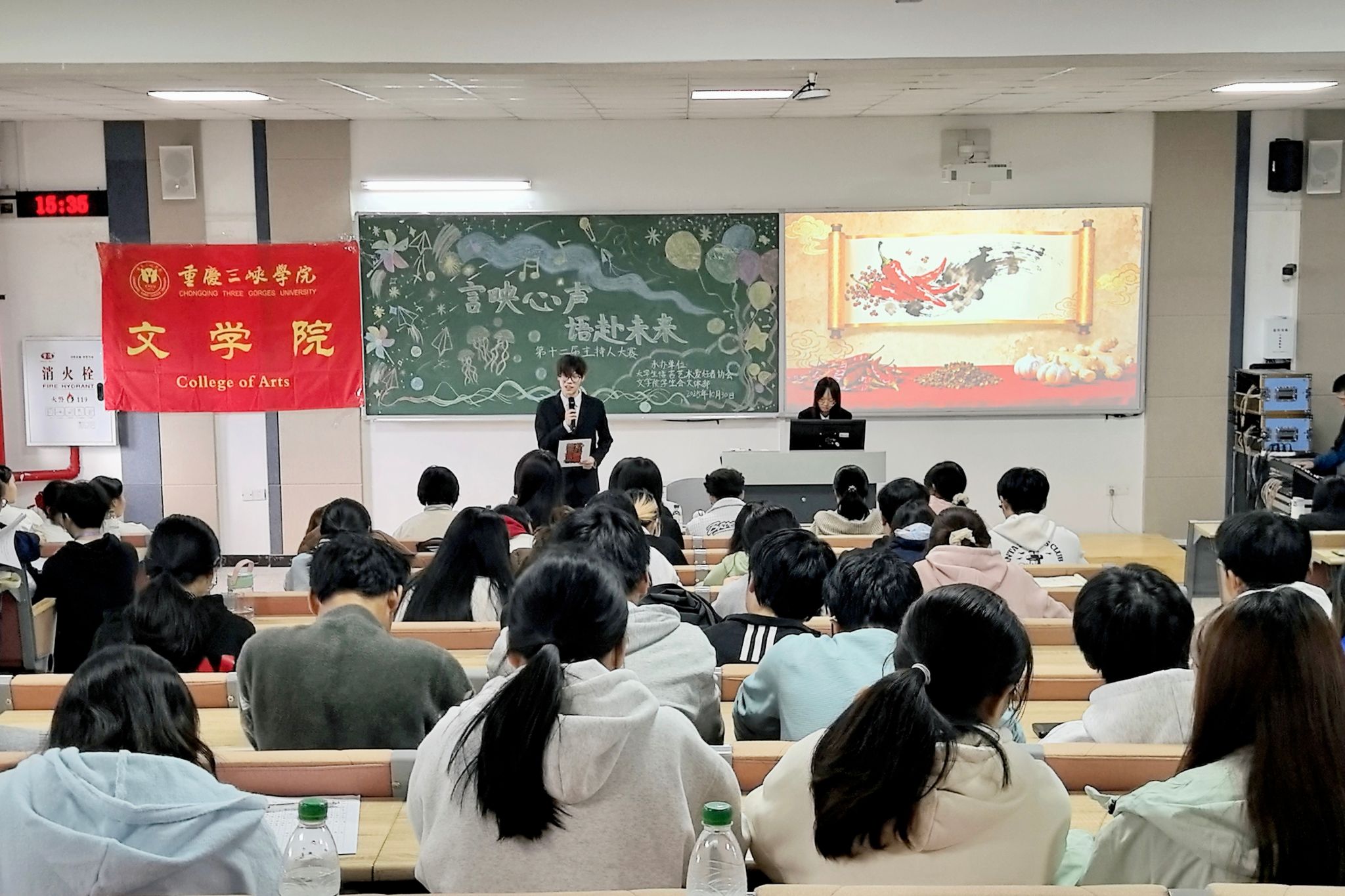 赛后,嘉宾评委对选手们的表现进行了专业点评,充分肯定了他们的才华与努力,并提出了宝贵建议。紧接着,全体选手与工作人员一同献上温情大合唱,悠扬的歌声凝聚了团队友谊与拼搏精神。经过评委公正评审并综合线上投票结果,本届大赛最终评选出“最受欢迎主持人奖”及各等次奖项。在热烈的掌声中,获奖名单正式揭晓:冯藏庆荣获一等奖;任开萌、谢香西荣获二等奖;赖思齐、郑鸿枭、湛晓路、王雨畅、吴斯颖荣获三等奖。其中,谢香西荣获“最受欢迎主持人奖”。