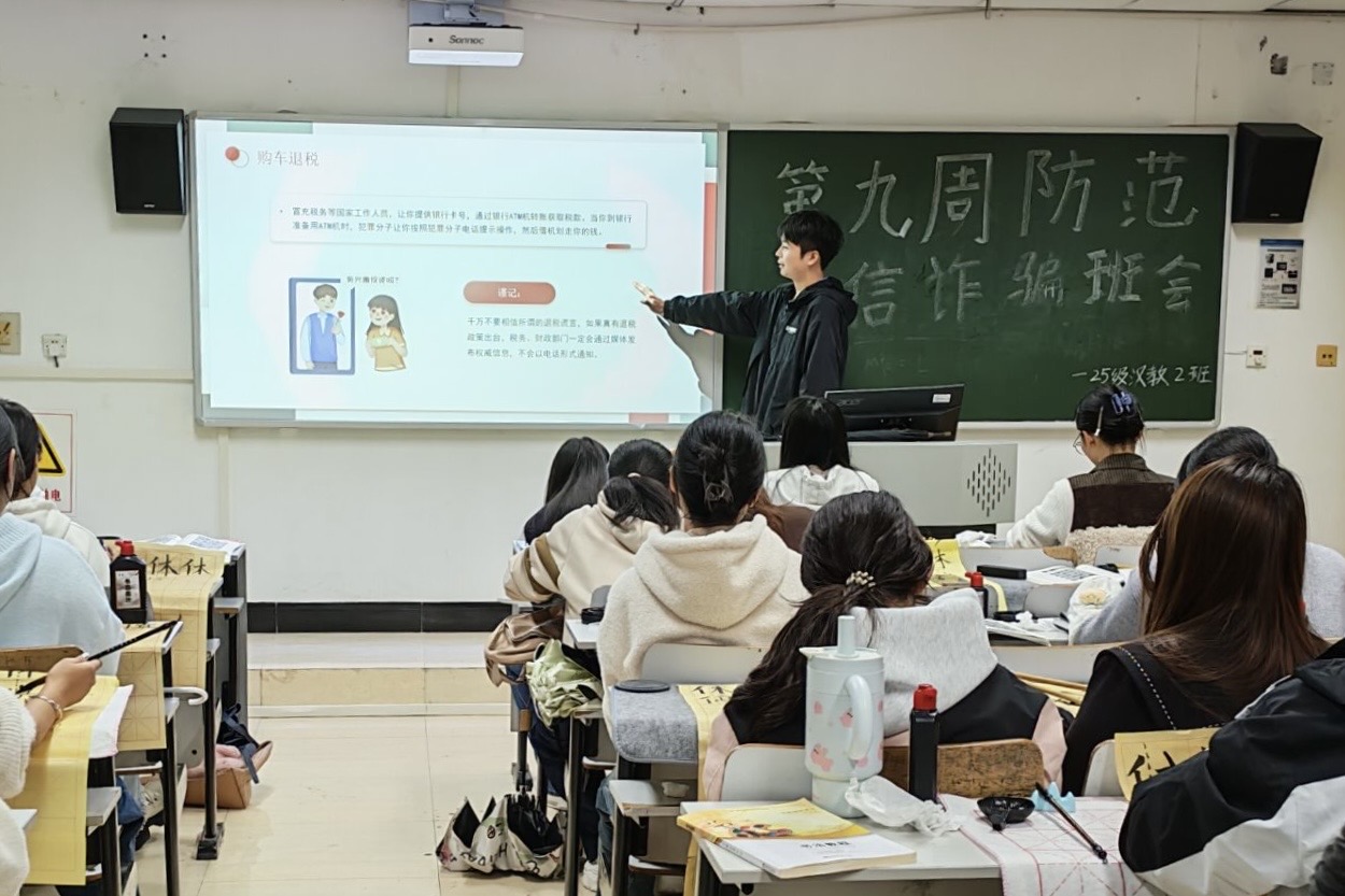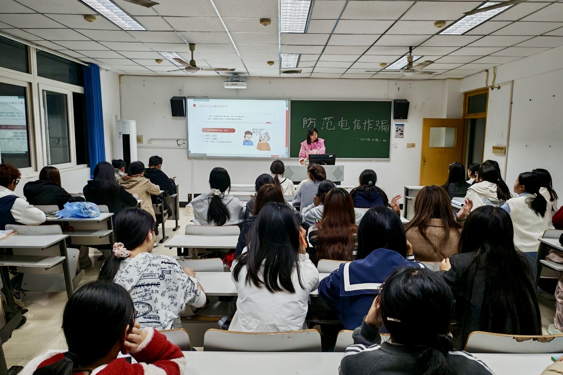 活动围绕电信诈骗的内涵展开,介绍了电信诈骗的特点和易受害群体范围。随后,辅导员通过梳理“冒充公检法”“虚假中奖”“钓鱼网站”“包裹藏毒”等典型诈骗手法,并结合近年来电信诈骗案件高发、涉案金额巨大的现实背景,向同学们揭示了诈骗犯罪的隐蔽性和危害性。同时,班会强调克服“贪利”心理、保护个人信息、谨慎核实陌生信息等防骗要点,引导师生从源头上规避诈骗风险,增强自我防护能力。在应急措施宣传环节,各年级辅导员详细讲解了遭遇诈骗后的正确处理方式,包括及时报警、阻断资金转移、拨打银联专线求助等关键步骤。最后,本次班会呼吁同学们主动成为反诈宣传的参与者,将防骗知识传递给亲友,共同构建“全员反诈、全院防骗”的安全网络。