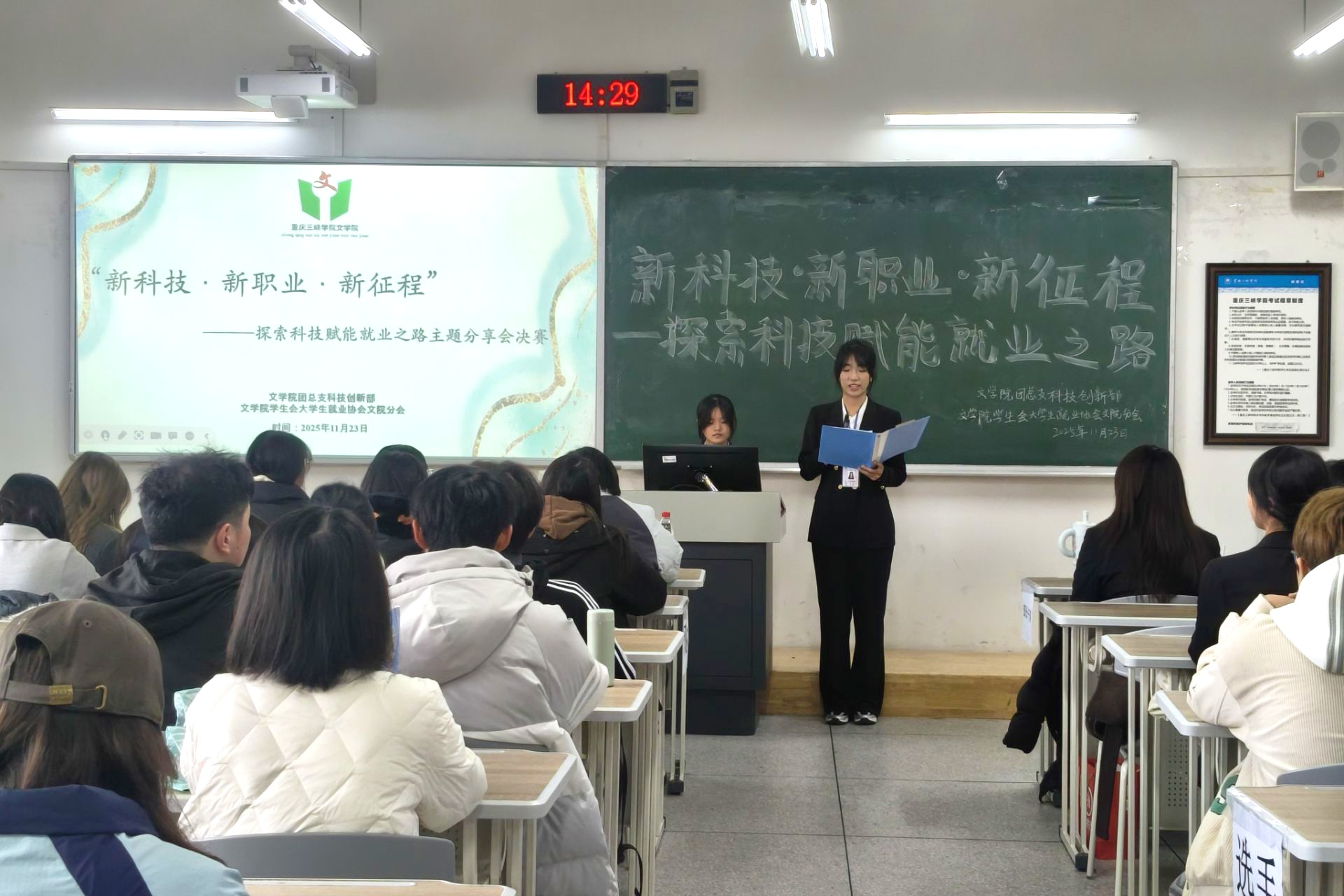 为探讨科技对教育、职业的影响及文科与科技结合的路径,帮助学生了解文科就业方向,11月23日,必赢线路检测科技创新部联合大学生就业协会文院分会在博学楼1栋103室成功举办“新科技·新职业·新征程”——探索科技赋能就业之路主题分享会决赛。必赢线路检测团总支(学生)副书记徐梦珂、学生会主席团成员汤雨欣和何倩、科技创新部部长刘诗颖受邀担任嘉宾评委。
