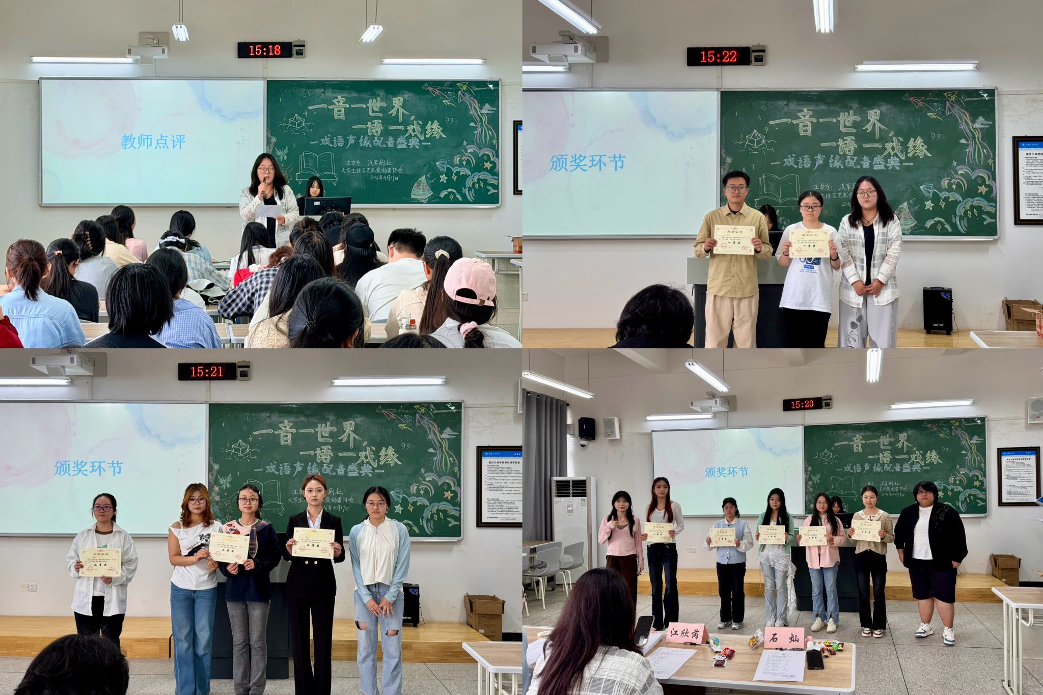 为弘扬语言艺术与戏剧文化,丰富校园文化生活,为声音爱好者搭建展示与交流的平台,4月19日下午,由浅草剧社、大学生语言艺术爱好者协会承办的“一音一世界,一语一戏缘”戏语声缘配音盛典决赛在博学楼一栋103室顺利举办。必赢线路检测兼职辅导员江欣芮、学习部部长向秦宇、三峡文学社副社长孙荣荣、三峡诗社副社长石灿参与本次活动。